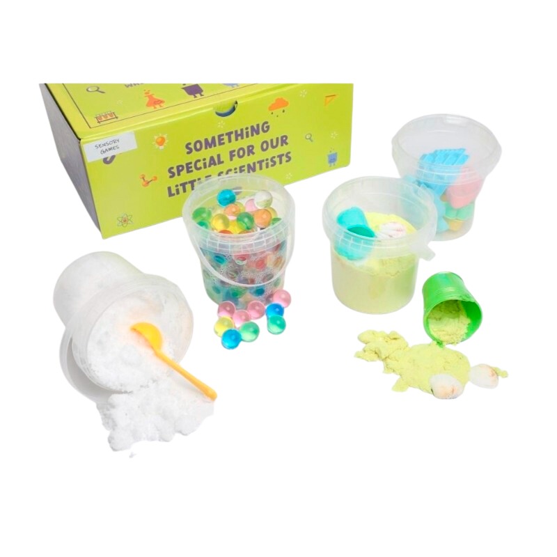 ﯾﺤﺘﻮي الصندوق على4 أنشطة : - ﻛﺮات اﻟﻤﺎء - اﻟﺜﻠﺞ اﻻﺻﻄﻨﺎﻋﻲ - اﻟﺮﻣﻞ - ﻋﻠﺒﺔ اﻷدوات -ﻋﺪة اﻟﺤﻤﺎﯾﺔ - طباشير - هدية صلصال