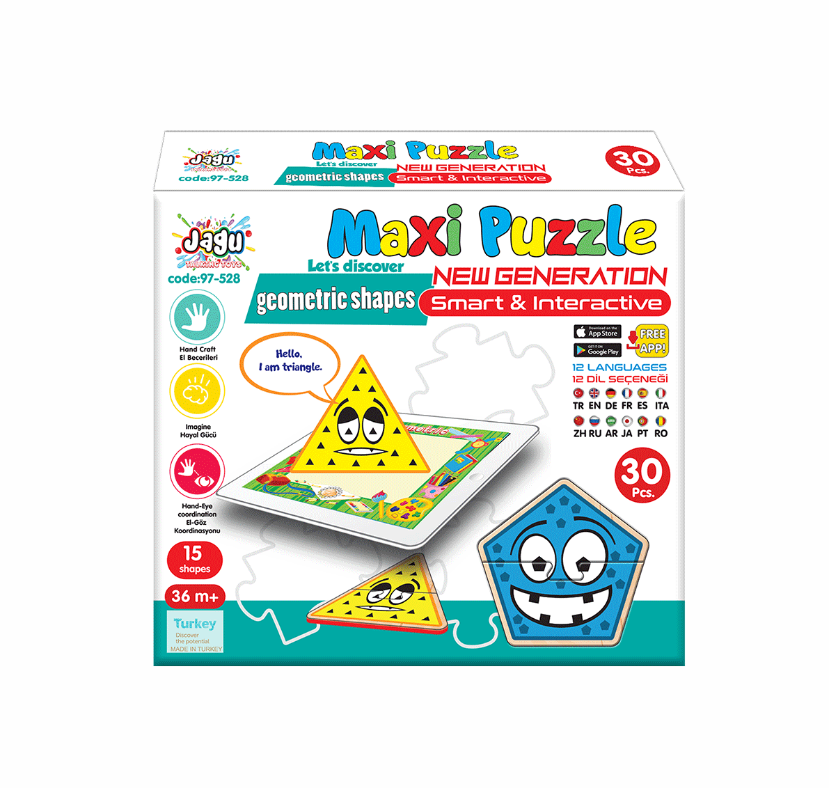 Thanks to the QR code on the box, you can download the application to your phone free of charge and make the shapes speak. Maxi Puzzle Geometric Shapes