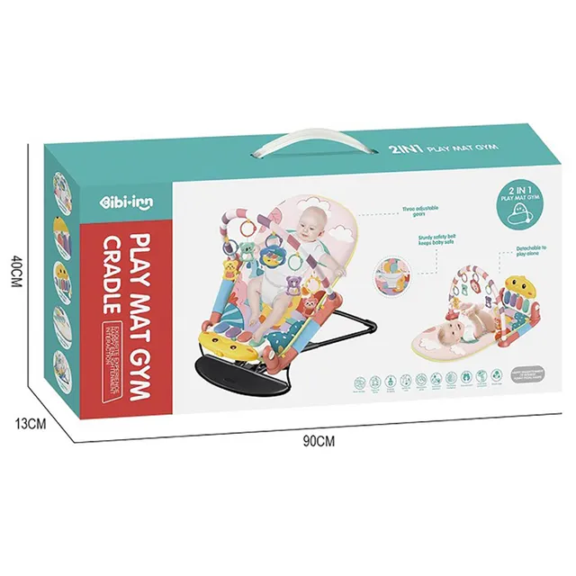 Baby Bouncer 2 In 1 Play Mat Gym With Cradle The Play Mat Gym Cradle has been developed by Ibi-irn which is a well-known brand for manufacturing items for infants and growing children. The product contains a soft mat where the baby can lie down safely and comfortably. The pedal harps are placed near the feet of the baby which gives a soothing tone whenever the baby kicks it. The product helps to keep the child engaged for hours while ensuring the child’s safety and comfort. The product helps develop the audio-visual senses of a child. It is a healthy exercise for growing children and helps them to identify different tones. Discover The best gift for your loved one. Weight & Dimensions Maximum Child Weight (kg) 9 Dimensions (cm) (Lx Wx H) 49x86x58