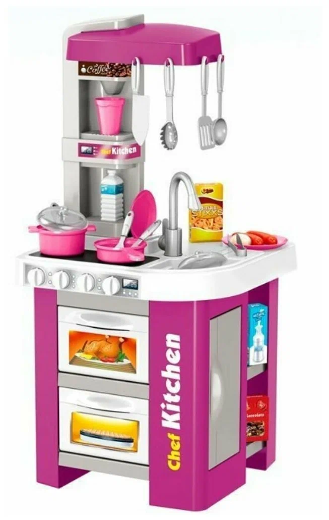 Children’s play kitchen with water and sound Talented Chef A fantastic young chef kitchen set that every little chef is sure to love. The kitchen set is completely made of safe plastic, it has accessories necessary for cooking, sound and light effects, running tap water, just pure professionalism in the kitchen. Safe kitchen for playing in the house, restaurants, bar – this is an offer for your children. A great gift idea for future chefs, chef assistants, restaurateurs, etc. Cooking game develops the child’s imagination, teaches how to learn how to cook, teaches household chores. Pure pleasure to “eat” delicious food prepared by your own child. A little chef can easily organize a birthday party for his dolls and teddy bears. Even more interesting is that while playing, the kitchen has a refrigerator for food storage, an oven, a sink and everything you need in the kitchen.