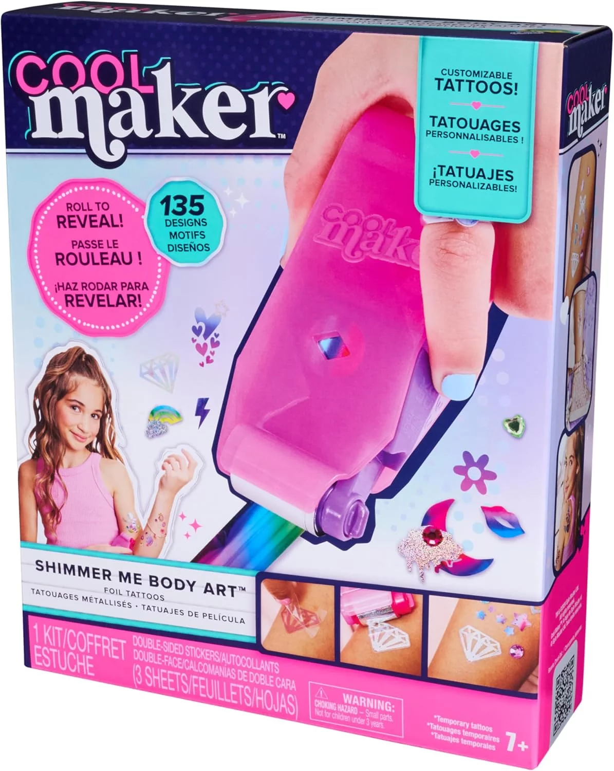 Create dazzling, skin-safe temporary tattoos with Cool Maker Shimmer Me. This fun and creative body art kit lets kids roll on shiny foil designs, decorate with gems, and mix hundreds of styles for eye-catching looks that are easy to apply and remove.• Create foil temporary tattoos with 135 designs,