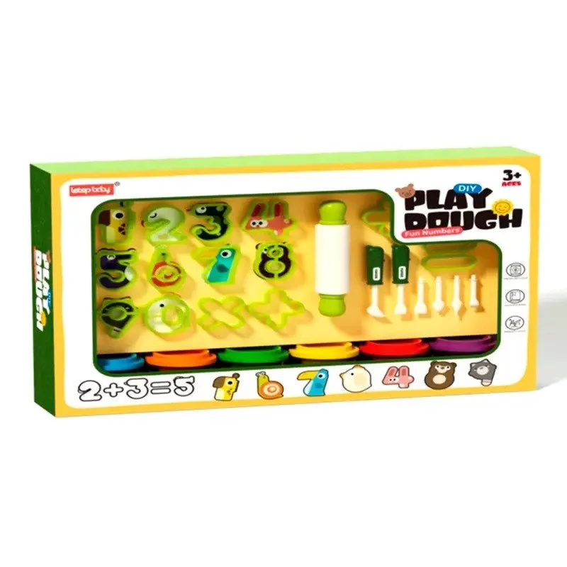 15*Number mold , 1 rolling pin . 2 Handle ,6 tools, 6 bottles of clay in assorted colors .