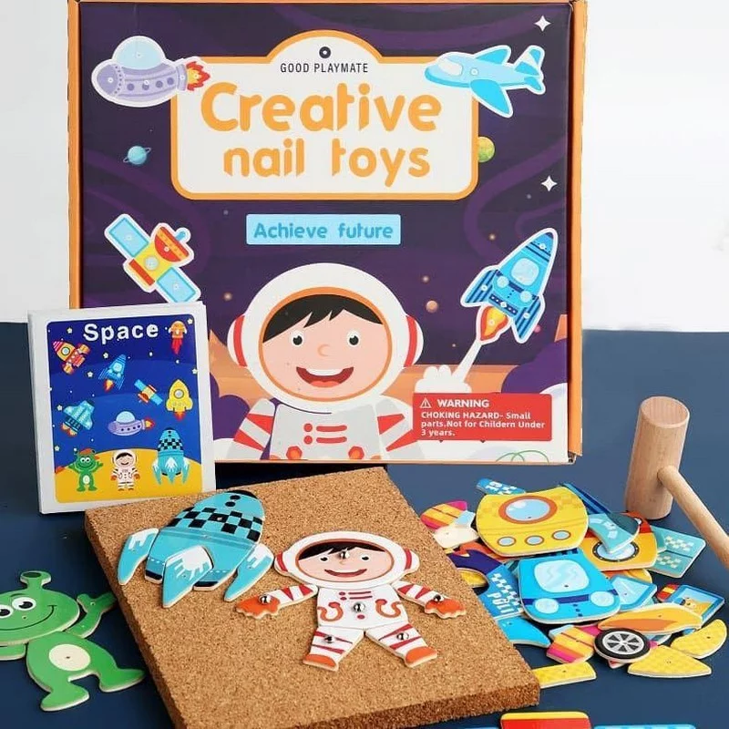This product allows children to learn to use real nails and mallets for hammering. Children put the nails in the drilled holes and then hammered them to fix them on the corkboard. Due to the openness of this activity, children can use their creativity to create their own original patterns and pi