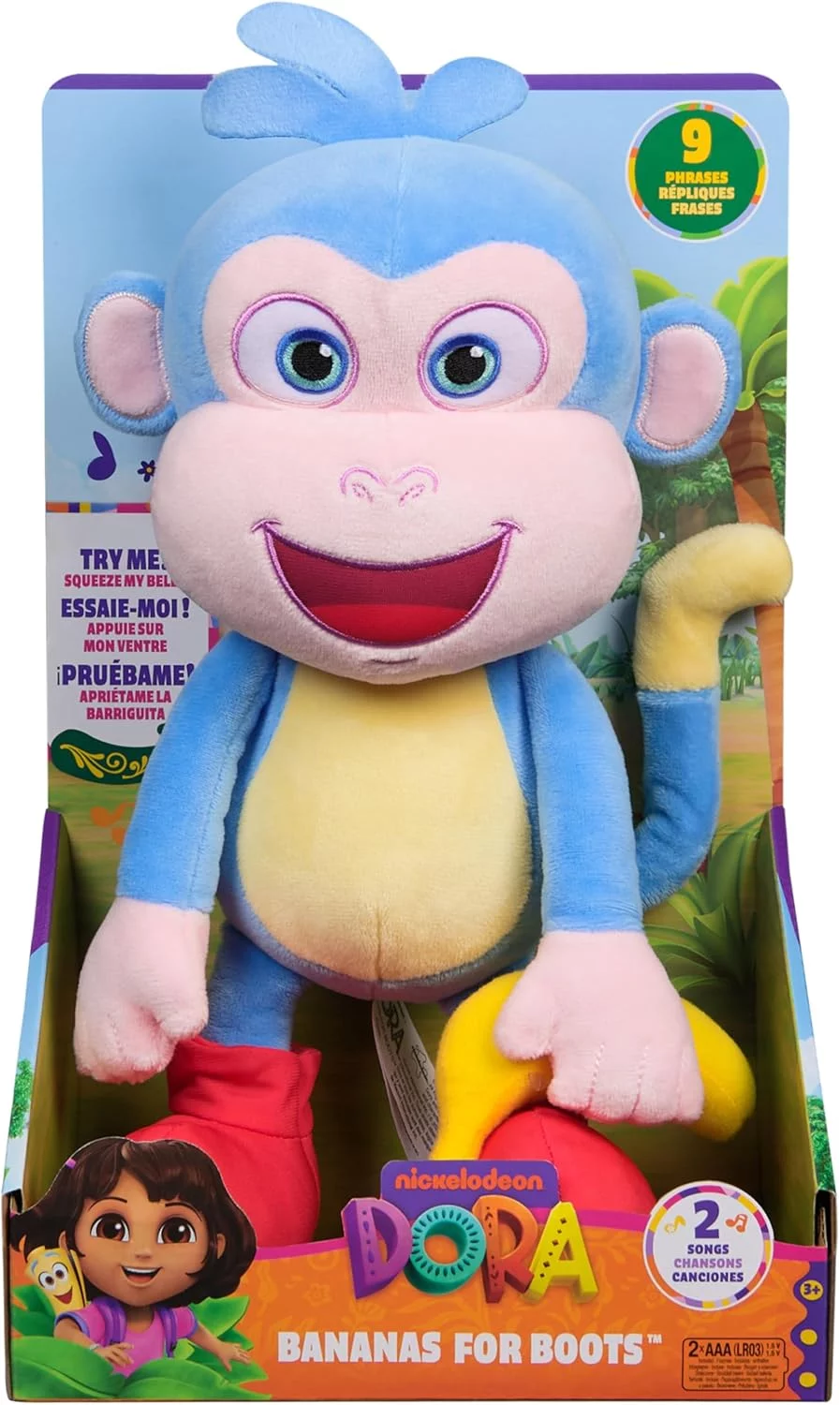 Snuggle up with Boots, Dora’s lovable monkey friend! This interactive plush brings Boots to life just like in the cartoon, featuring his bright smile, iconic red boots, and ultra-soft blue and yellow fur. With songs, phrases, and sensory features, this plush toy is designed to delight little explore