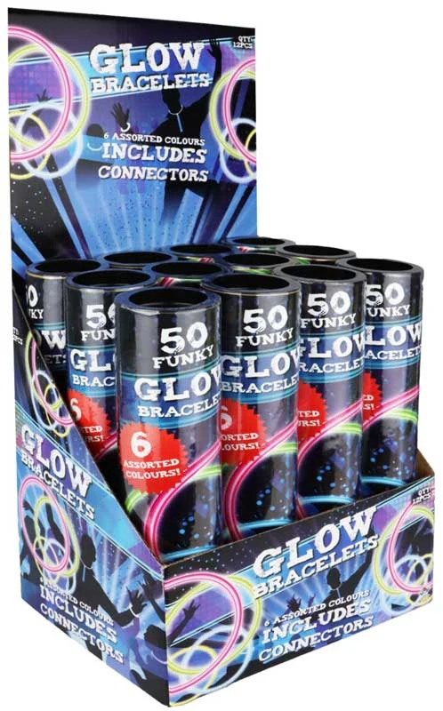 These glow bracelets measure 21. 5cm and are supplied with connectors, making them suitable accessories for parties. Each tube contains 50 bracelets. The bracelets come in 6 assorted colours: Blue, Green, Orange, Pink, Red, and Yellow.