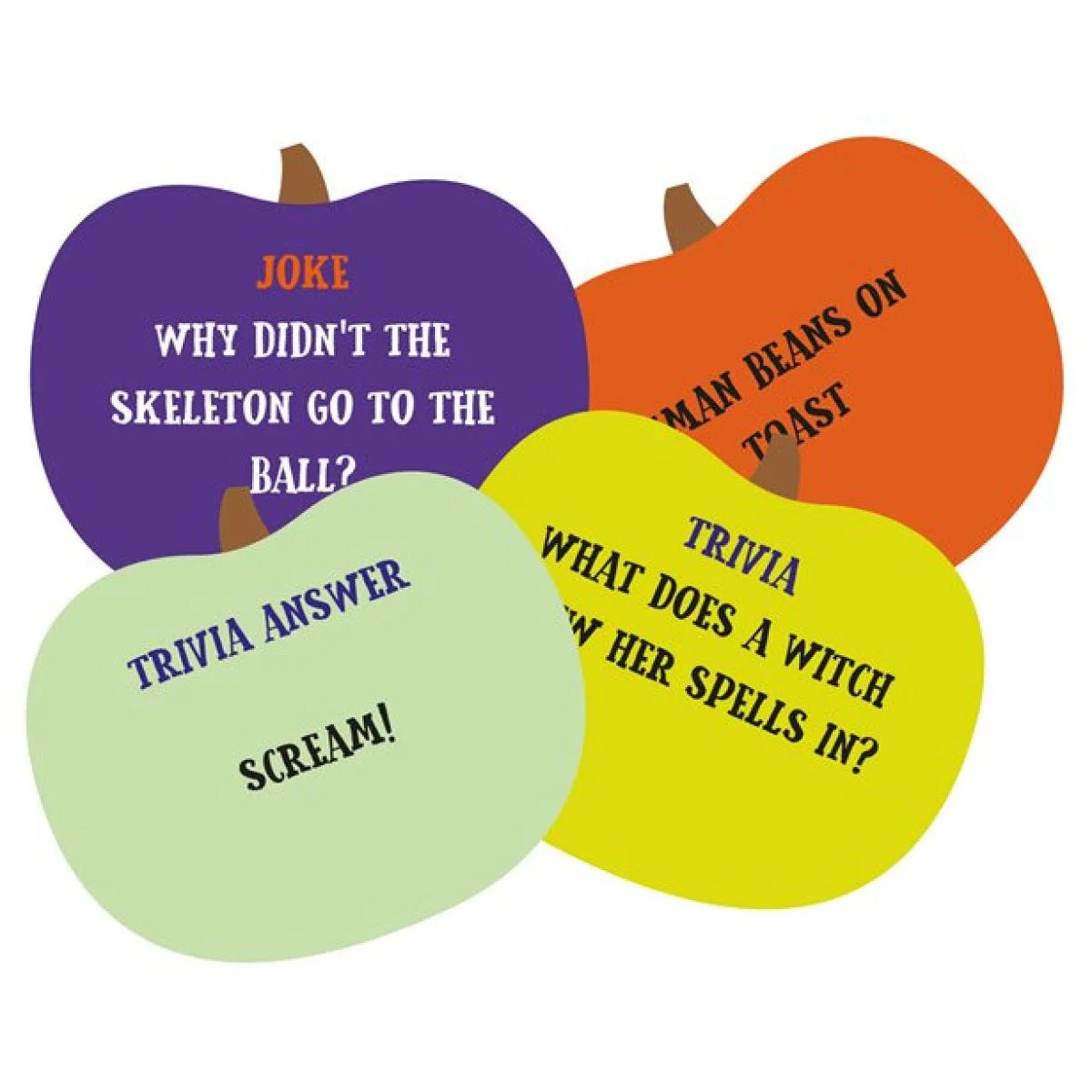Contains 3 pumpkin shaped joke and trivia cards with answers on reverse Each measure 7cm
