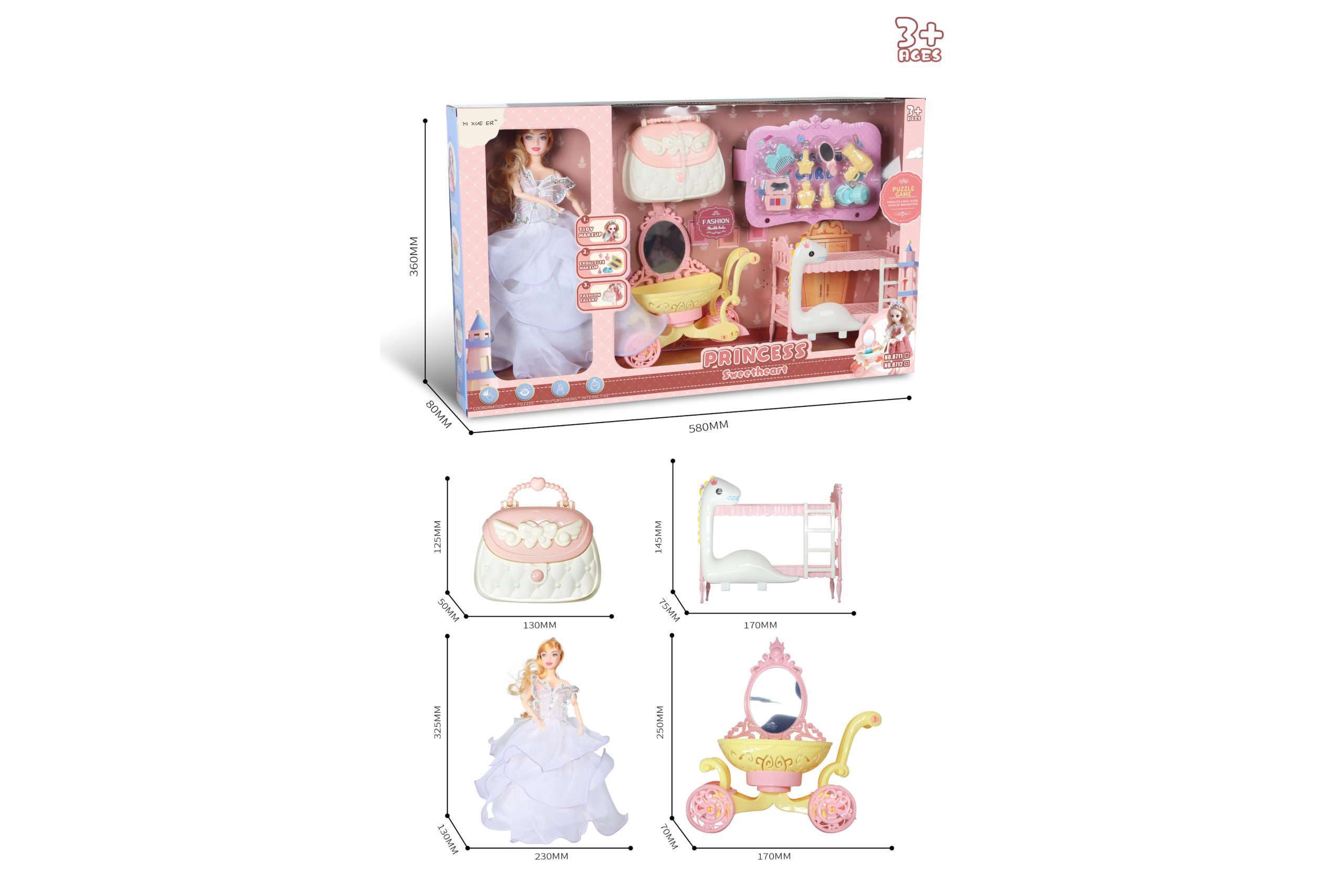 PRINCESS SWEET HEART DOLL SET WITH DRESSING TABLE, HAND BAG, STEP BED