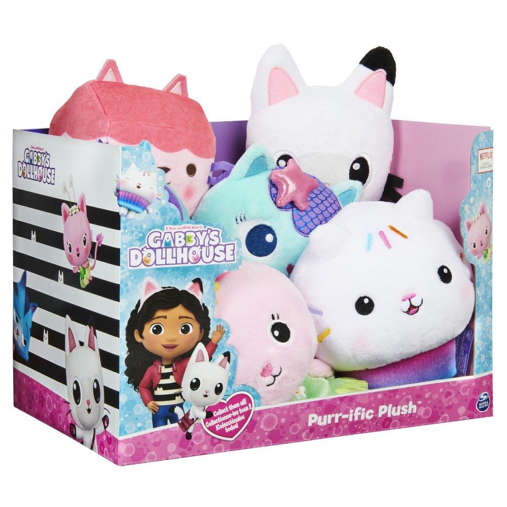 Bring home the irresistible kitty characters from Gabbys Dollhouse with the Purr-ific Plush! This adorable plush toy features super soft colorful fabric and embroidered details, bringing Gabbys cat-tastic friends to life. At 8-inches tall, the cats are the perfect size for cuddles or playtime, at home or on-the-go! From Gabbys best pal Pandy Paws? signature pointy ears, Cakey Cats sweet sprinkle details, Mer Cats metallic mermaid fabric and more, each Purr-ific Plush stuffed animal (each sold separately) looks just like the character from the NETFLIX original series. Kids can collect all of the cuddly soft toys from the ishow and use their imagination to create their own adventures with their new plush pals. Snuggle up with the Gabbys Dollhouse Purr-ific Plush Characters!