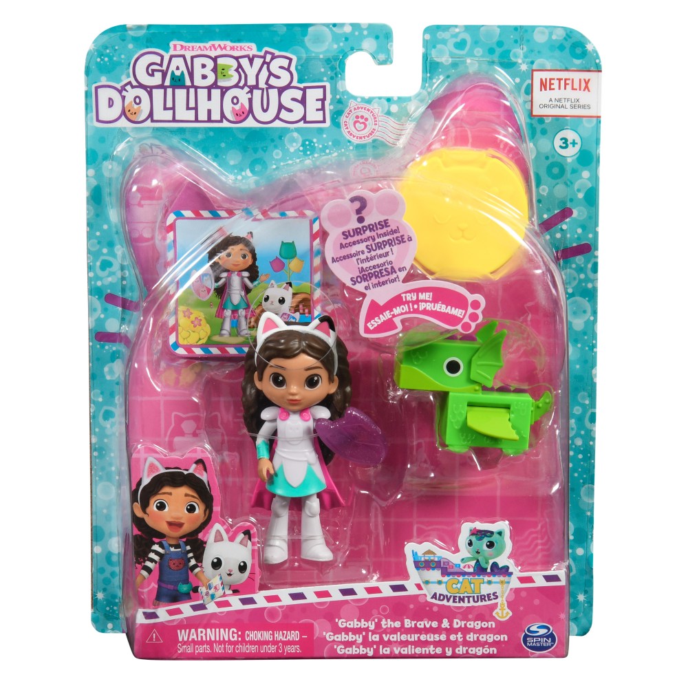 Product Name Gabby’s Dollhouse Cat-tivity Pack Asst. Overview Dive into thrilling medieval adventures with Gabby Girl and her adorable dragon companion! This captivating playset brings the magic of Gabby’s Dollhouse to life, featuring interactive elements and surprises that inspire imaginative play. Description The Gabby’s Dollhouse Cat-tivity Pack features Gabby dressed in her enchanting cat-themed knight armor, complete with magical cat ears. Both Gabby and her dragon are crafted with authentic designs from the show, making them perfect for fans. Unbox the special Dollhouse Delivery to discover a delightful surprise: a pink knight’s scepter adorned with molded glitter! This set also includes a charming chip-art photo keepsake of Gabby and her dragon, Pandy Paws, in their medieval knight attire. For action-packed play, slide Gabby’s purple shield onto her hand and press down on her head to make her arm move up and down. Kids can also flap the dragon’s wings, bringing their pretend adventures to life as they save the day! Additionally, scanning the QR code inside the Dollhouse Delivery unlocks a special reward in the free Gabby’s Dollhouse App (available on i OS and Android), adding an interactive layer to the play experience. For expanded fun, explore more Gabby’s Dollhouse products, including the Gabby Cat Friend Ship, Gabby’s Purrfect Dollhouse, and themed Dollhouse Rooms (each sold separately), to create an even richer dollhouse world. Specifications Included Characters: Gabby Girl and her dragon Features: Knight armor and magical cat ears Pink knight’s scepter with glitter Purple shield for interactive play Chip-art photo keepsake of Gabby and Pandy Paws Interactive Element: QR code for app rewards Recommended Age: Suitable for imaginative play for young children Expandability: Compatible with other Gabby’s Dollhouse products The Gabby’s Dollhouse Cat-tivity Pack is perfect for children who love to create their own magical adventures, providing endless opportunities for pretend play and storytelling!