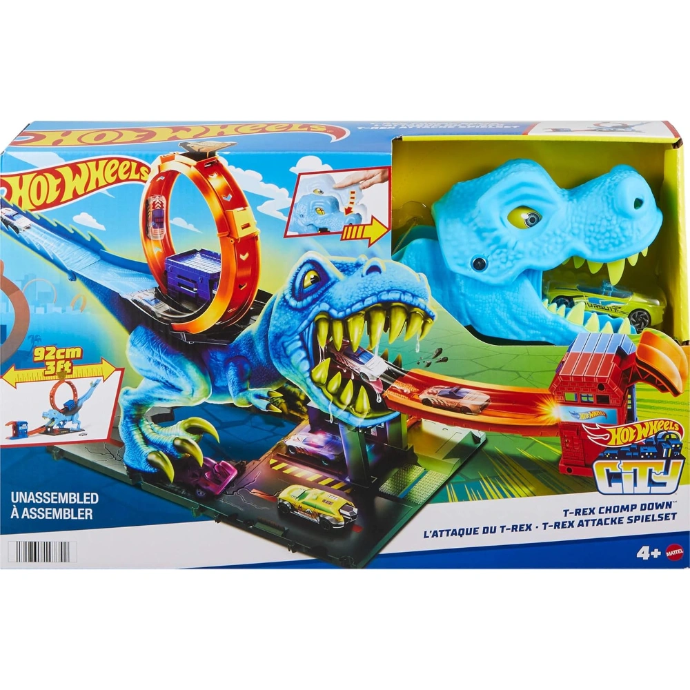 Carpet the dinosaur and save the city with the Hot Wheels City Track Race on the T-Rex. Whizz your Hot Wheels along the 23cm high loop and defeat the beast! When you put it on the carpet, the dinosaur’s eyes go from furious yellow to X by KO! Includes 1 Hot Wheels vehicle and you can connect it to other sets. Suitable for ages 4 years and up. Colours and decorations may vary.