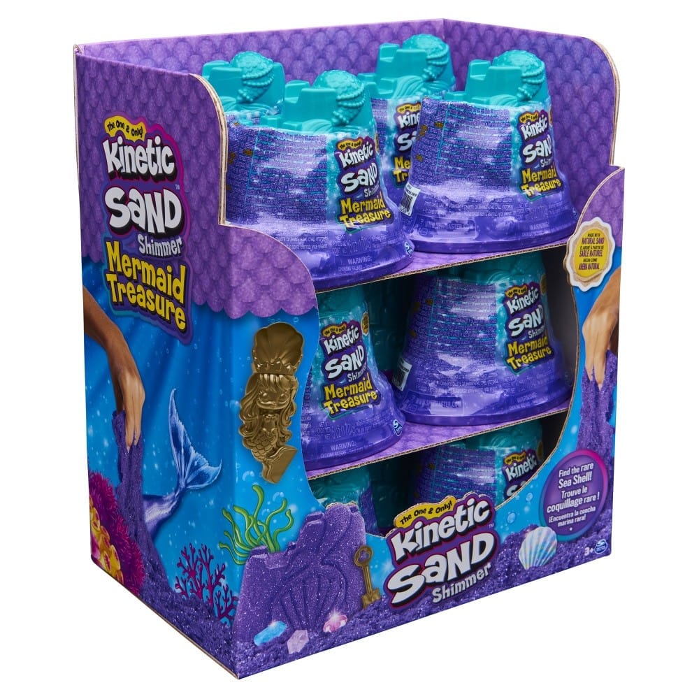 Introducing the Kinetic Sand Mermaid Treasure! Open your mermaid container to discover a shovel to dig through the isand. The castle is filled with shimmer sand, mermaid tools, and hidden gems. Use the mold to create clam shells. Can you find the rare large opal sea shell? When you are finished playing, store your sand back into the Mermaid Treasure for easy clean-up. Kinetic Sand is the original magical, moldable and mesmerizing play sand. Better than arts and crafts modeling clay, this sensory sand never dries out, so you can play with Kinetic Sand for hours of tactile independent play. it is a great addition to sensory bins. Let it flow through your hands ? it is so satisfying, you won?t be able to put it down! Kinetic Sand is made with natural sand and is non-toxic and hypoallergenic. It magically sticks together and cleans up easily. Kinetic Sand develops creative and sensory skills and allows kids to create anything they can imagine! Kinetic Sand kids toys for 3 year old boys and girls are the perfect gift for kids.