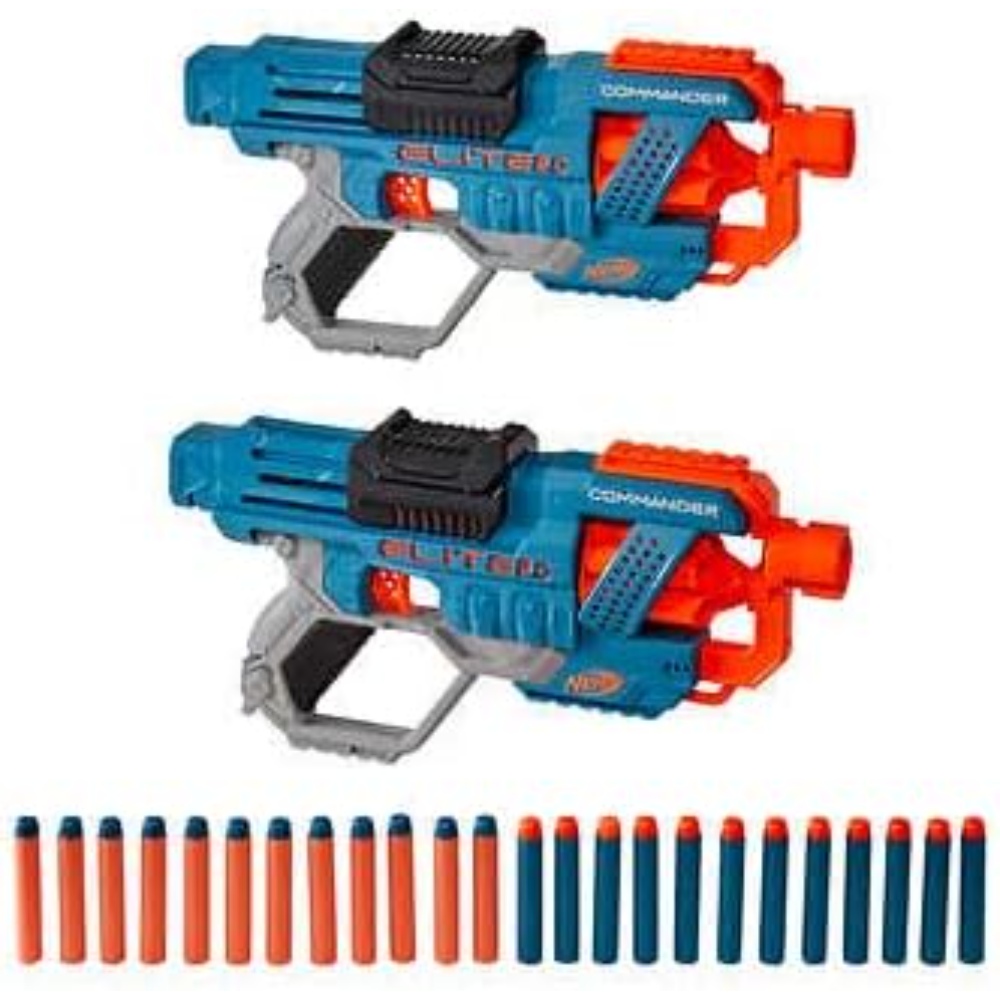 Nerf Elite 2. 0 Commander 2-Pack Product Overview: The Nerf Elite 2. 0 Commander 2-Pack delivers double the fun with two high-performance blasters. Each blaster features a 6-dart rotating drum and advanced firing capabilities, making it perfect for rapid-fire action and intense Nerf battles. Features: 6-Dart Rotating Drum: Rapid-Firing Capability: Each blaster includes a rotating drum that holds up to 6 darts, allowing you to fire 6 darts in a row. Slam-Fire Mode: Hold down the trigger and move the priming slide back and forth to unleash all 6 darts rapidly. Firing Distance: Long-Range Blasting: Fires darts up to 27 meters (90 feet) for extended reach in battles. Tactical Rails and Attachment Points: Customization Options: Features tactical rails and barrel and stock attachment points (stocks and barrel extensions sold separately) for adding accessories and personalizing your blaster. Includes 24 Official Nerf Darts: Ready for Action: Comes with 24 Nerf Elite foam darts, providing plenty of ammunition for extended play. How to Use: Load: Insert darts into the 6-dart rotating drum. Prime: Pull the priming slide back. Fire: Press the trigger to shoot 1 dart. Slam-Fire: Hold down the trigger and slide back and forth to fire all 6 darts rapidly. Contents: 2 Commander RD-6 Blasters 24 Nerf Elite Foam Darts Safety Information: Ages: Suitable for children aged 8 and up. Eye Safety: To avoid eye injuries, do not aim at eyes or face. Eyewear is recommended for players and anyone nearby. Choking Hazard: Contains small parts. Not suitable for children under 3 years. No Batteries Required: Operates without the need for batteries. Summary: The Nerf Elite 2. 0 Commander 2-Pack offers an exciting Nerf experience with its high-capacity, rapid-firing blasters. Perfect for dual battles or sharing with a friend, this set ensures dynamic and thrilling play with advanced firing features and ample dart supply.