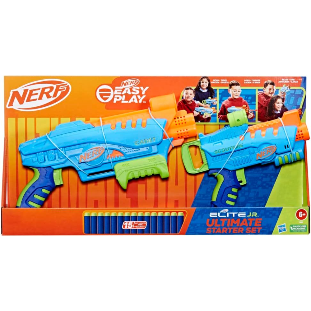 Nerf Elite Jr easy-play toy foam Nerf blasters are designed for boys and girls who are blasting into Nerf battles for the first time. Special features make them easy to play with, so children will be playing exciting Nerf games in no time. They can launch into high-energy dart-blasting indoor and outdoor play and experience the thrill of doing it all by themselves. The blasters are easy to hold, sized to fit comfortably in small hands and lightweight for easy carrying in kids outdoor games. The front-loading design makes it easy to insert darts. Blasting is easy, with handles having the lowest pull force of any Nerf dart blasters. All these features let children get into fast-moving action, and they can show off their blasting skills as they do each step on their own! The easy-play Nerf Elite Jr Ultimate Starter Set includes 2 backyard toy foam dart blasters, 2 targets and 15 Nerf Elite foam darts. Eyewear recommended (not included). Nerf and all related properties are trademarks of Hasbro.