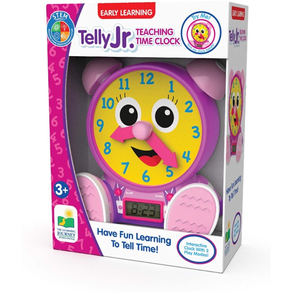 Product Name: Telly Jr. Teaching Time Clock (Pink) Product Overview: The Telly Jr. Teaching Time Clock is an innovative educational tool designed to help children ages 3 and up learn to tell time in both analog and digital formats. This interactive clock features engaging modes that make the learning process enjoyable and effective, ensuring that kids gain confidence and skills in understanding time. Specifications: Age Range: 3 years and up Modes: Learning Mode: Teaches time in five-minute increments Quiz Mode: Asks children to match the hands to the time displayed on the LCD screen Power Source: Requires three AA batteries (included) Color: Pink Dimensions: Compact size suitable for small hands Description: The Telly Jr. Teaching Time Clock is more than just a clock; it’s a fun learning companion that turns the complex concept of telling time into a playful activity. In Learning Mode, as children move the clock hands, the LCD screen updates to show the corresponding digital time, reinforcing their understanding of time increments. In Quiz Mode, children are prompted to adjust the hands to match the time shown, encouraging active participation and retention of skills. This educational clock promotes essential developmental skills by enhancing listening, visual, tactile, and motor abilities. It provides a hands-on approach to learning that keeps children engaged and eager to practice. Additional Information: Safety Compliance: All Learning Journey products are rigorously safety tested and comply with all relevant domestic and international toy safety regulations. Award-Winning Design: The Learning Journey has a reputation for creating high-quality educational toys that have been recognized with numerous awards, ensuring that kids love to learn while playing. Interactive Learning: Designed to provide hours of interactive fun, fostering a positive learning environment that builds self-confidence and critical thinking skills. Transform the way your child learns to tell time with the Telly Jr. Teaching Time Clock (Pink) — where education meets fun!