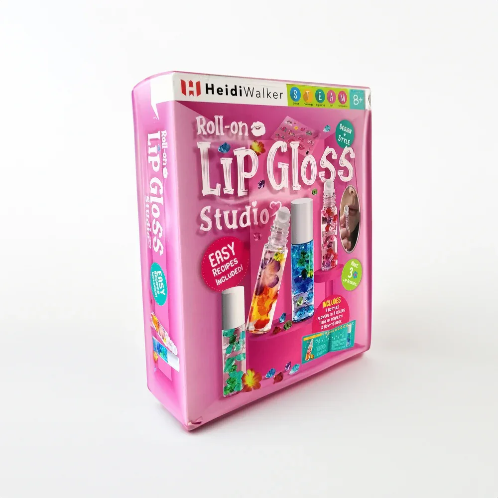 3 LIP GLOSS BOTTLES BAG OF FAUX CRYSTAL BOTTLE OF ROSE FLAVOR BAG OF CONFETTI FAUX FLowers STICKER GLOVES, PIPING BAGSTIRRING STICK ,MIXING CONTAINER ,BAG OF LIP GLOSS BASE ,SHEET OF PUNCH-OUT PAPEREASY-TO-FOLLOW BOOK