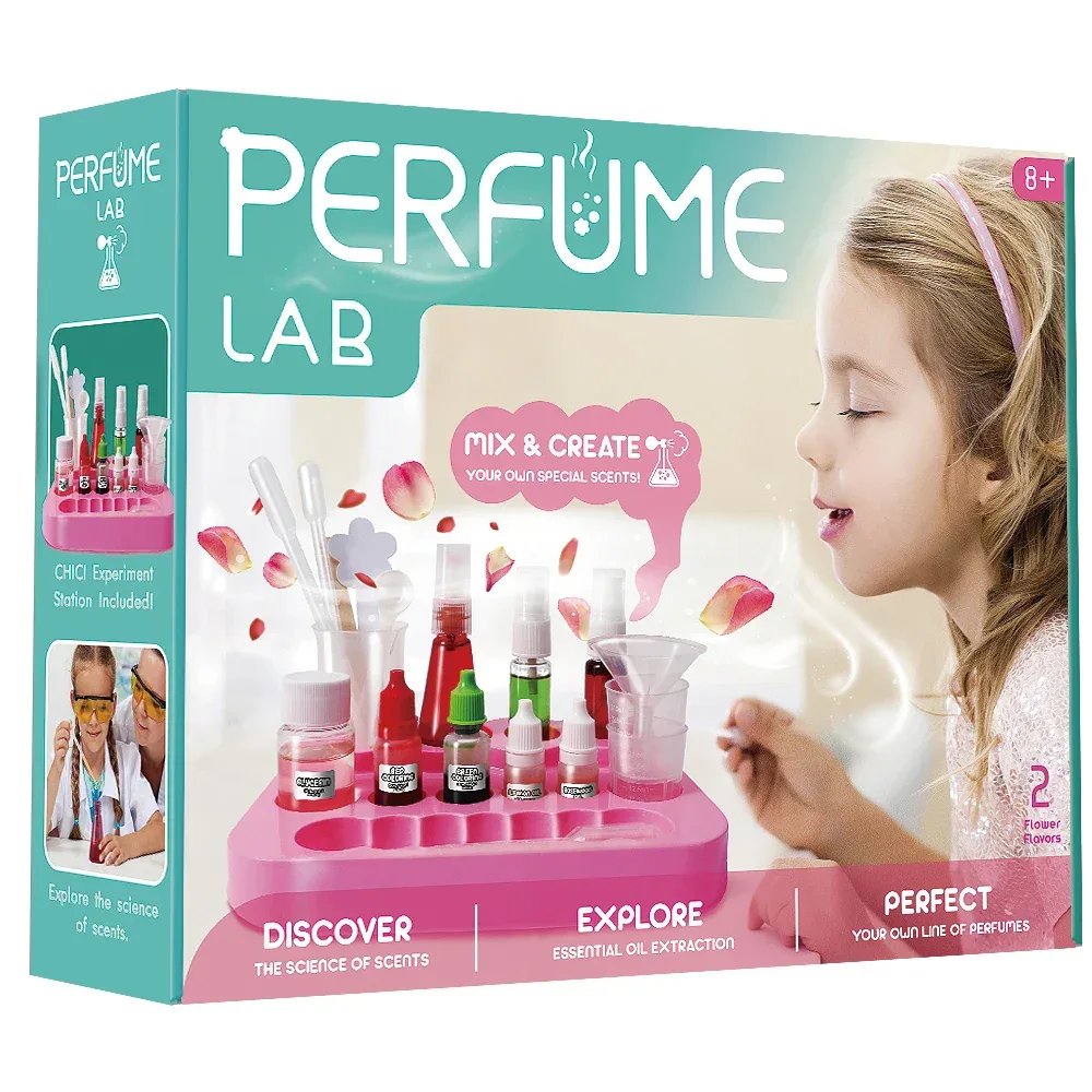 2 Bags of Flower Petals Spoon Measuring Cups Stirring Stickssticker Funnel .Filter Papers Vials Droppers, Glycerin, Pigments, Essential Oil .Pair of Gloves, Scent Strips Perfume Lab Station Guide Book