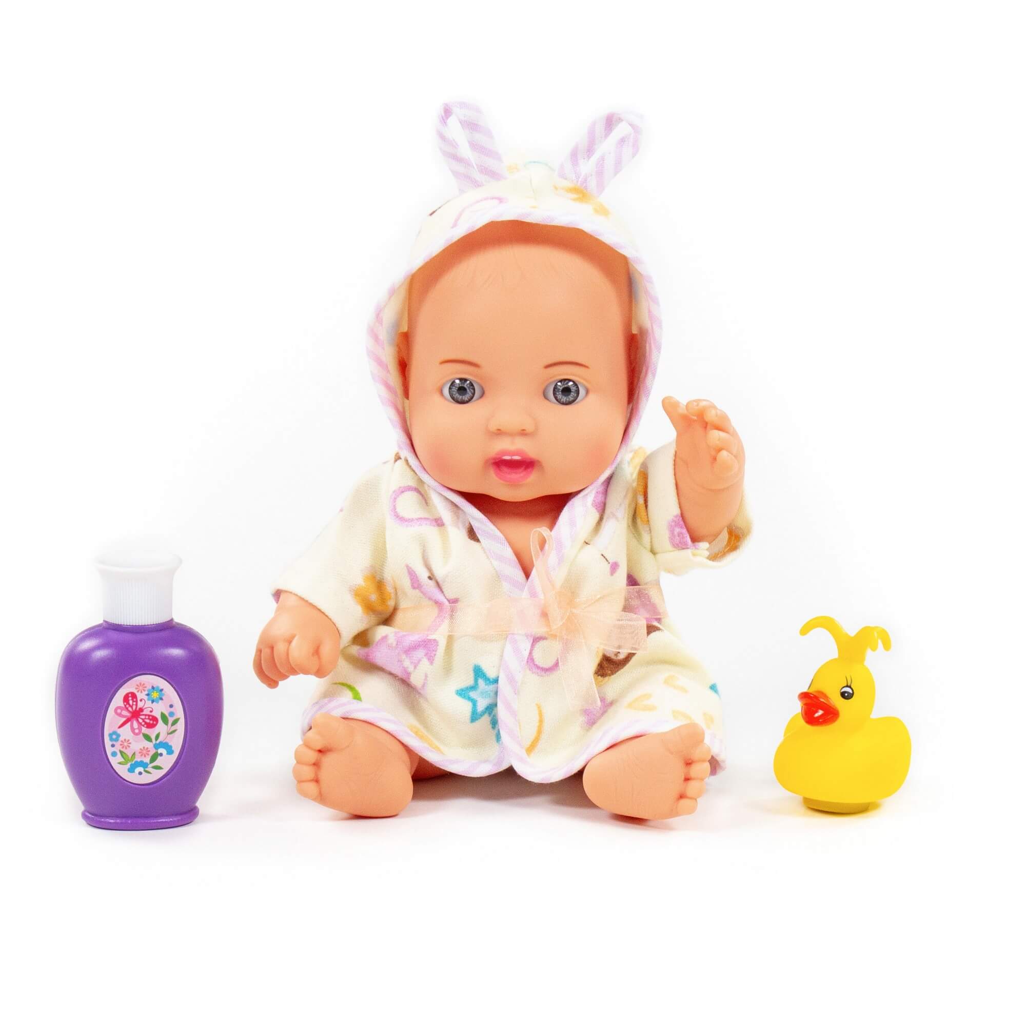 The toy is made of high quality materials, the doll’s eyes do not close. The baby doll is dressed in a stylish robe with ears, like a real baby. The doll comes with a bathing set, which consists of 2 elements: a rubber duck and a bottle imitating a baby bath. This configuration will diversify the game and make it even more interesting and realistic. The child will be able to bathe the baby doll, coming up with various scenarios for the game.
