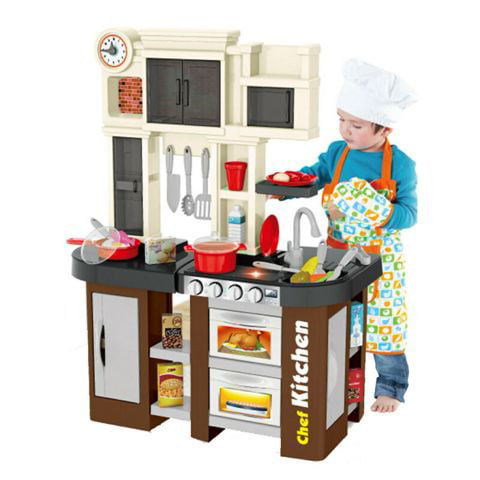 1) Burners with light and sound effects. The hob has a very modern look: instead of imitating traditional “gas” burners, modern “glass ceramics” are built into the worktop. There are 4 control knobs in front of it. Both burners have all the light and sound effects inherent in a “real” stove, including the sounds of boiling water and the sound of oil crunching. 2) A water tap with an electric pump on batteries. During the game, you can wash the dishes, serving items and products from the set: just pour 1 glass of water into the sink, turn the tap handle – water starts to flow from it. The water can be poured into a saucepan or glass from the supplied set of accessories. 3) Corner table top. The large corner worktop provides a convenient access to the kitchen from two sides: from the front to the hob, oven and refrigerator; on the right – to the sink, the second side refrigerator and the work table for cutting food and serving dishes. There is a special stand-dryer for plates or lids behind the sink. 4) Side table. An additional side table expands the working space of this kitchen model. A refrigerator and two side shelves are built into it, and one of the supports of the sideboard is fixed on top. Thanks to a convenient corner tabletop and an additional table, several children can play with the kitchen at the same time. 5) Sideboard with doors. The high back pillar simulates a large kitchen cupboard. It is equipped with a wide variety of shelves. Three cabinets have semi-transparent hinged doors. Under the central mezzanine there is a holder-rail with three hooks for kitchen accessories – a knife, a spatula and a spaghetti spoon. All cutlery, crockery and food packages can be stored in the cupboards. 6) Two refrigerators. This is a unique model of the play kitchen because it has not one, but two refrigerators! Each of the refrigerators is equipped with an additional shelf, which greatly increases the convenience of using it. Now everything will be like in a real mother’s kitchen: for example, one of the refrigerators will be considered a freezer, and it will be possible to store all “frozen” products in it – meat, fish or packages with semi-finished products. 7) Watch for training. This watch has real moving hands and a stylish dial. With their help, you can set the time, control the cooking period and hours of food intake. During the game, your kid will be able to learn and consolidate the basic skills of determining the time using the dial of this watch. 8) A set of 32 accessories. There is a pot and pan for cooking, lids for them, a milk bottle, a plate and cutlery. And there are also a variety of products from which a young chef can prepare many dishes. You don’t need to buy anything! Kitchen composition: base with oven, microwave oven and side refrigerator, countertop with stove and sink, buffet counter with shelves, additional table with refrigerator and shelves