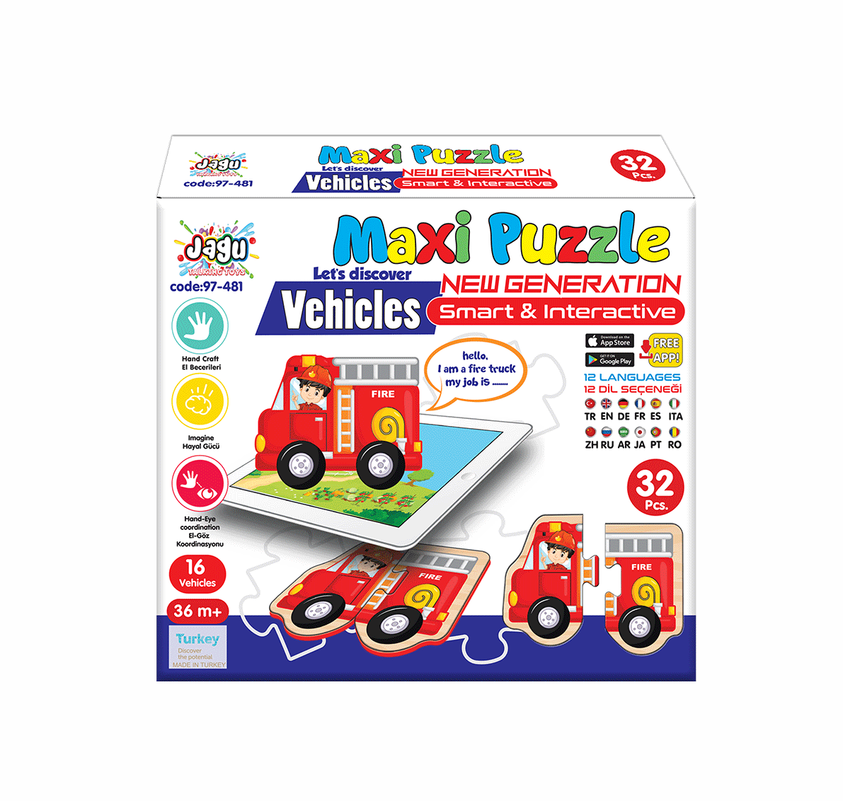 Thanks to the QR code on the box, you can download the application to your phone free of charge and make the shapes speak. Maxi Puzzle Vechicles