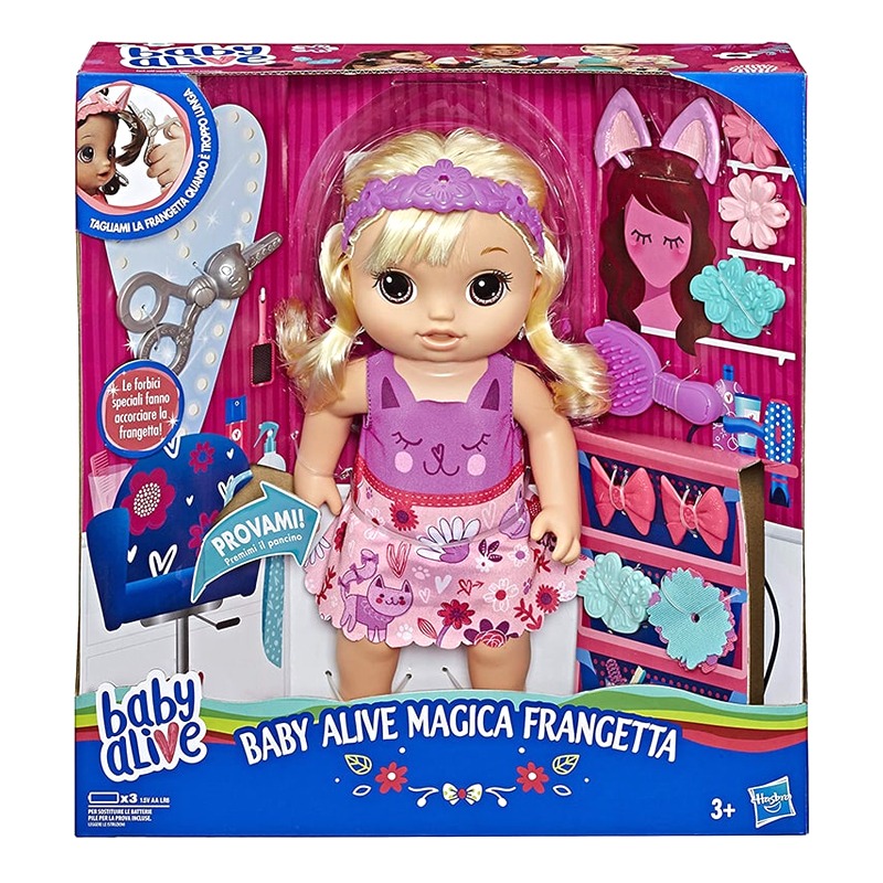 امنح الطفلة تسريحة شعر جديدة كل يوم مع دمية بيبي ألايف سنيب آند ستايل بيبي بشعر أشقر صفف خصلات شعر الطفلة على جبهتها بالفرشاة التفاعلية لجعل شعرها ينمو قص الشعر باستخدام المقص التفاعلي أكثر من 35 صوت وحركة يمكنك استكشافها حرك المفتاح للتبديل بين أوضاع مامي ودادي 12 ملحق مختلف من آذان القطة وحتى الورود القماشية لجعل مظهرها جميلًا