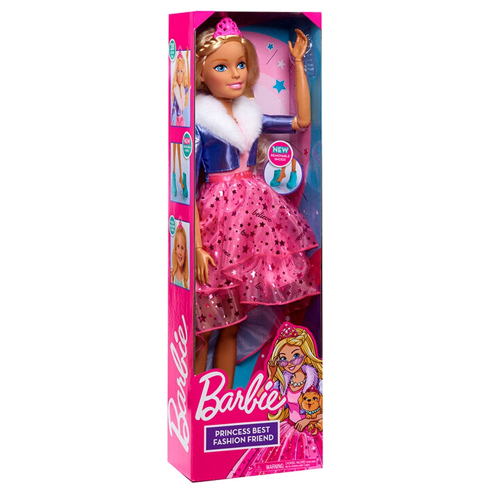 دمية باربي بأزياء عصرية من جست بلاي. - دمية مفصلية بحيث يمكنك تحريكها في أوضاع مختلفة. - تتميز بأحذية رياضية قابلة للإزالة وتنورة وسترة أنيقة أرجوانية اللون مع ياقة من الفرو الصناعي وتاج قابل للإزالة. - مصنوعة من مواد عالية الجودة. - الطول التقريبي للدمية: 71 سم. - الفئة العمرية المناسبة: 3 سنوات فما فوق.