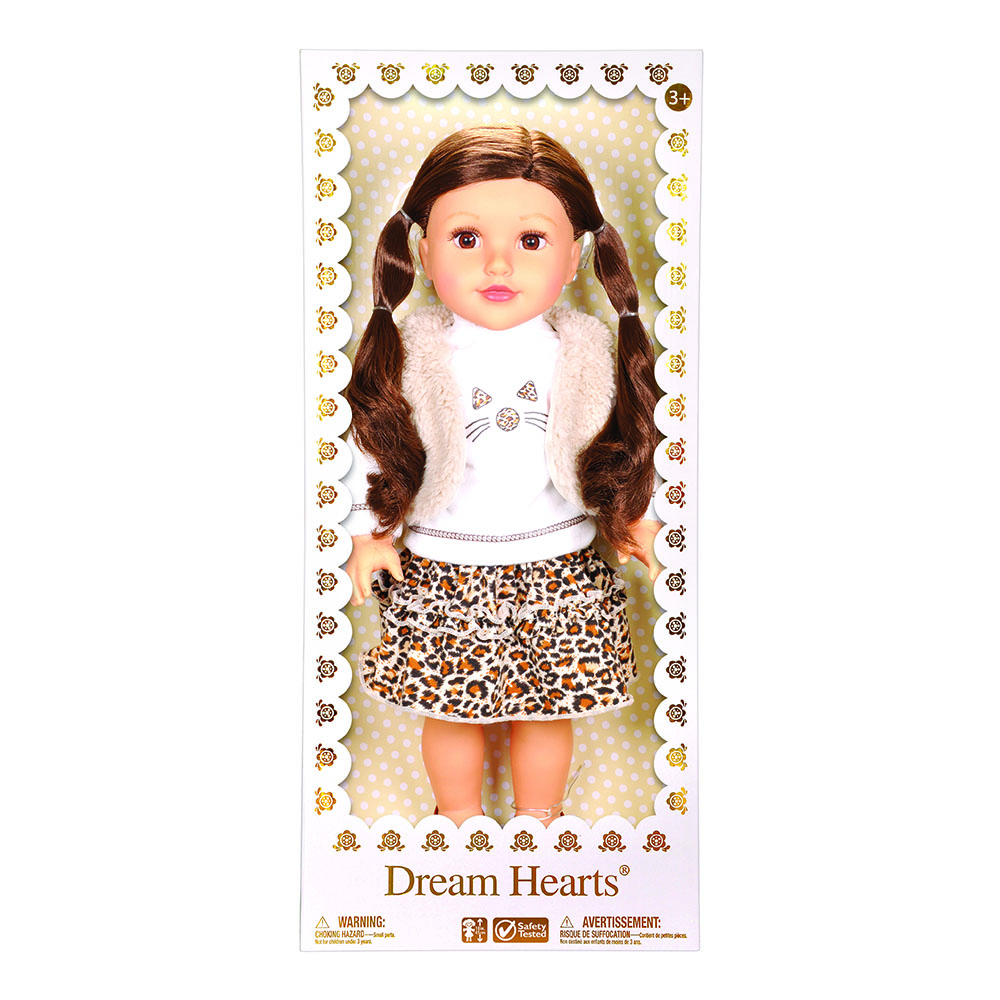 دمية دريم هارتس. - تتميز الدمية بتنورة تايقر وأحذية حمراء. - تتميز بأذرع وأرجل قابلة للدوران وشعر طويل الجذور - يمكن تمشيط شعرها الطويل الجميل وتسريحه. - مصنوعة من مواد عالية الجودة. - طول الدمية التقريبي: 45 سم. - الفئة العمرية المناسبة: 3 سنوات فما فوق.