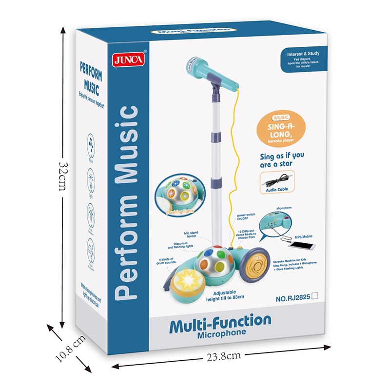 أبقِ طفلك منبهرًا بالميكروفون الموسيقي متعدد الوظائف ذو الألوان الزاهية. - تتميز بـ12 إيقاعات رقص مختلفة للاختيار من بينها. - 4 أنواع من أصوات الطبل. - آلة كاريوكي للأطفال للغناء جنبًا إلى جنب، تتضمن ميكروفونًا واحدًا وأضواء ديسكو وامضة. - ارتفاع قابل للتعديل حتى 83 سم. - تحفز التنسيق بين العين واليد. - تنمي المهارات الحركية الدقيقة لدى طفلك. - مناسبة للأعمار من سن 2+ سنوات فما فوق.