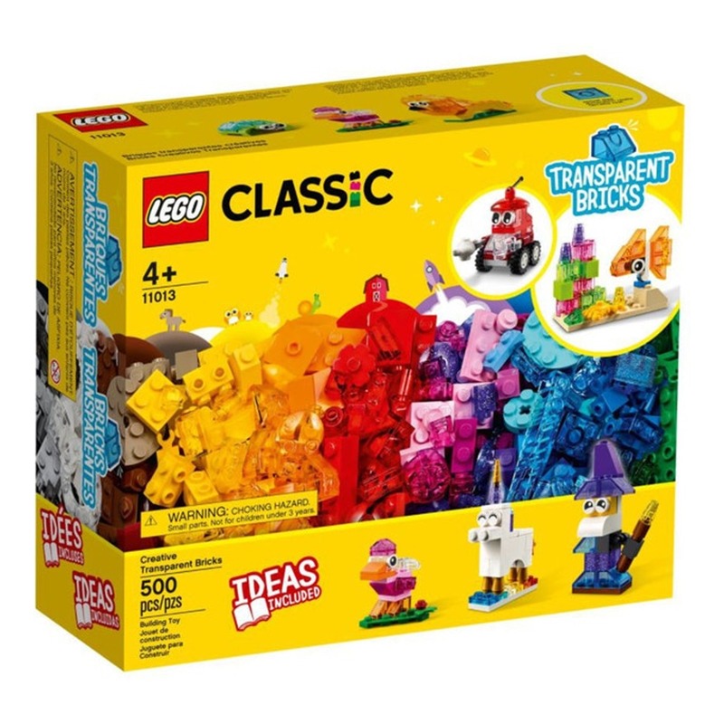 Have fun building all kinds of structures with the 11013 LEGO Classic Creative Transparent Bricks (500 Pieces) Dazzling array of transparent bricks in different colors, shapes and sizes, plus classic LEGO bricks, eyes and wheels Includes guide with directions to build 8-simple structures like a lion, a bird, a unicorn, a wizard, a turtle and more