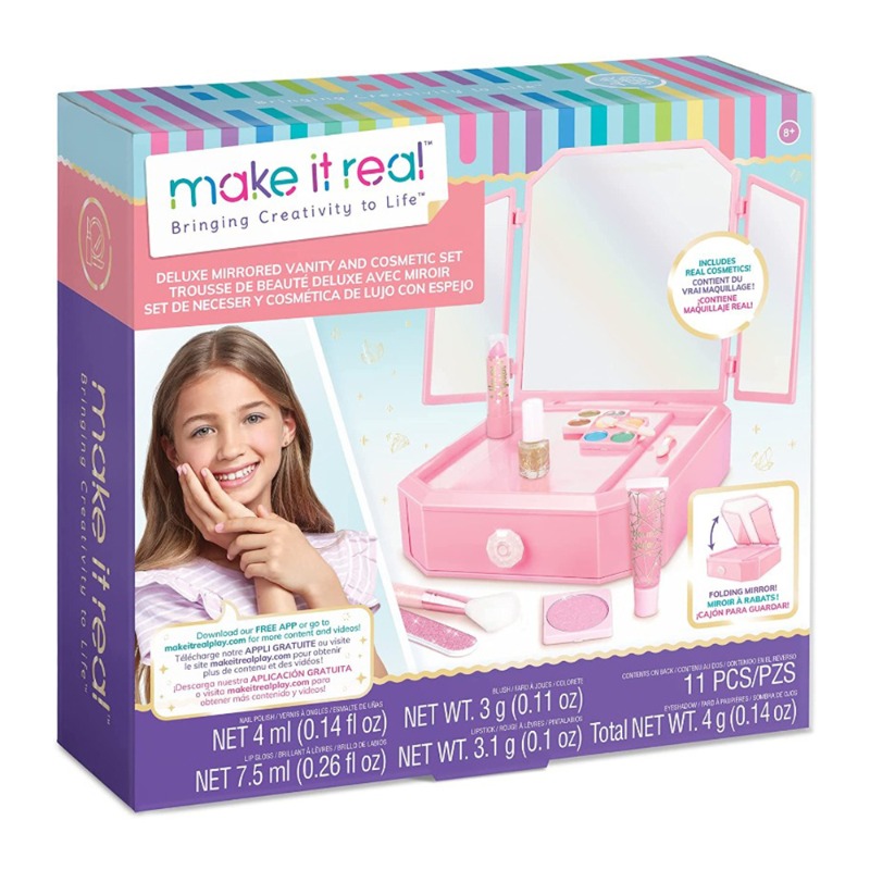 سيحب الأطفال ارتداء الملابس مع مجموعة مرآة فانيتي ومستحضرات التجميل. - تأتي هذه المجموعة كاملة مع ظلال العيون ، وأحمر الخدود ، وهايلايتر ، ونوعين من ملمع الشفاه ، وطلاء الأظافر ، ومبرد الأظافر. - يتم طي المرايا الجانبية للصندوق بحيث يغلق تمامًا مثل صندوق التخزين. - المجموعة تشمل: 1 مرآة الغرور ، زجاجتان من طلاء الأظافر (ذهبي ووردي) ، 1 مبرد أظافر ، عدد 2 من مظلل العيون، 1 فرشاة تجميل ، 1 أنبوب ملمع شفاه ، 1 عصا ملمع الشفاه ، 1 مرطب شفاه ، 1 باليت أحمر الخدود ، 1 باليت هايلايتر ، 8 ألوان لظلال العيون. - مناسبة للاعمار من 8 سنوات فما فوق.