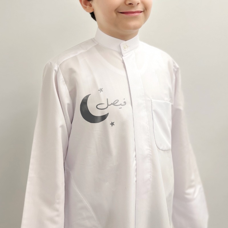 - دشداشة تقليدية للاحتفال بشهر رمضان والقرقيعان والعيد. - يمكنك تطريز اسم طفلك على القماش. - تتميز بتطريز عالي الجودة.