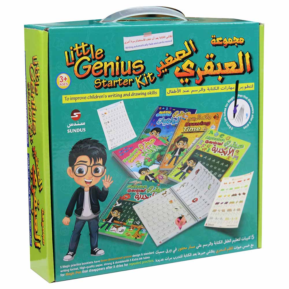 كتب للأطفال لتحسين مهارات الكتابة والرسم. - 5 كتيبات تدريب سحرية لها تصميم ثلاثي الأبعاد وتنسيق قياسي للكتابة ، ورق عالي الجودة ، قوي ومتين مع 5 أنابيب حبر إضافية للقلم السحري الذي يختفي بعد أن يجف لتكرار الممارسة. - تحتوي على 5 كتب: عبقرية أبجدية للحروف العربية ، عبقرية أبجدية للحروف الإنجليزية ، عبقرية في الرياضيات ، أرقام عبقرية ، وقت الرسم. أنابيب الحبر ، القلم السحري.