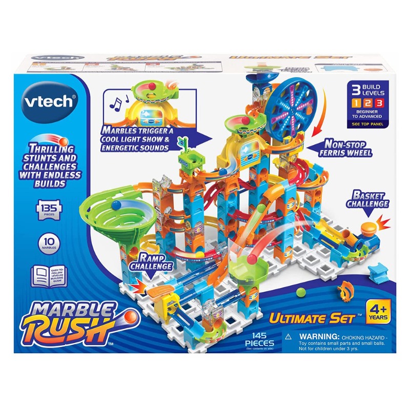مجموعة المسار الدوار من في تك. - تشتمل مجموعة البناء على 128 قطعة بناء. - تتميز بعجلة فيريس دوارة ومخروط عرض ضوئي موسيقي ومسارات سريعة وقاذفات شديدة وغير ذلك مما يمكن توصيله ببعضه بسهولة. - تساعدك الكتل المرمزة بالألوان ودليل سهل المتابعة في إنشاء مجموعة متنوعة من الإنشاءات المختلفة من المبتدئين إلى المتقدمين أو إنشاء المباني الخاصة بك. - تتضمن 10 كرات من الرخام لإسقاطها وإطلاقها من خلال الدورات. - يتطلب بطاريتين AA. - الفئة العمرية المناسبة: من 4 سنوات فما فوق.