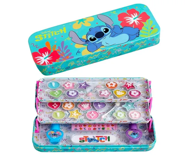 Organize your beauty essentials with the AIR VAL Stitch Makeup Tin with 3 Folding Trays. Inspired by Disney’s mischievous Stitch, this durable tin case combines playful design with practical functionality. Crafted from sturdy metal, it ensures long‑lasting use while the compact yet spacious structure makes it perfect for travel or home organization. The three folding trays provide smart storage, allowing you to neatly arrange brushes, palettes, and accessories for easy access. Featuring vibrant Stitch artwork, this case adds fun and personality to your vanity or bag. The secure lid closure keeps items safe, while the lightweight build offers convenience wherever you go. A must‑have collectible for Lilo and Stitch fans, this makeup tin blends durability, organization, and Disney charm, making it the ideal gift or personal accessory.