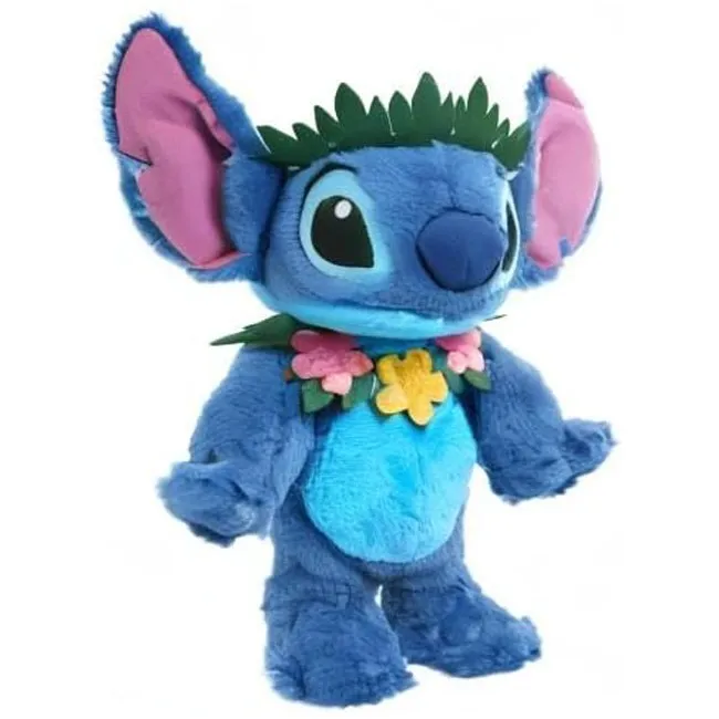 Bring home the fun spirit of Stitch with this interactive Stitch Dance and Sing Feature Plush! Standing approx. 38 cm tall, this adorable plush features Stitch in a tropical lei and headdress, ready to hula‑dance and serenade you. Simply press his foot (or squeeze his hand) to activate: he’ll sway, sing the cheerful “Aloha” song and delight young fans with his playful motion and music. Made from soft, premium plush fabrics, this cuddly companion is perfect for hugs, playtime and display. This toy combines music, movement and beloved character charm from the Lilo and Stitch franchise. Whether it’s for imaginative play, gifting, or just hugging your favourite blue alien, this Stitch plush adds joyful entertainment to any home.