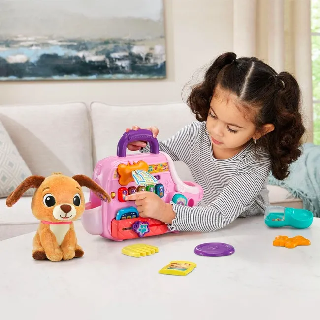 Delight young pet lovers with the V-Tech Cutie Puppy Carrier, an interactive toy that combines imaginative play with early learning fun. This adorable puppy comes nestled inside a colorful, easy-to-carry pet carrier, making it perfect for play at home or on the go. Press the light-up buttons to hear cheerful songs, playful sounds, and friendly phrases that introduce colors, emotions, and basic care concepts. The soft puppy encourages nurturing role play, while the carrier handle is designed for little hands to grasp comfortably. Built for durability and safe play, this engaging toy helps develop motor skills, responsibility, and creativity while keeping toddlers happily entertained.