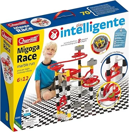 Challenge your friends with the new Migoga Race Track! A special "marble shooter" allows you to start off up to 8 marbles ( 8 different colours) at the same time. Don't be misled by the starting positions, the marbles will take different routes, getting lost in side tracks, multiple rails and dead end