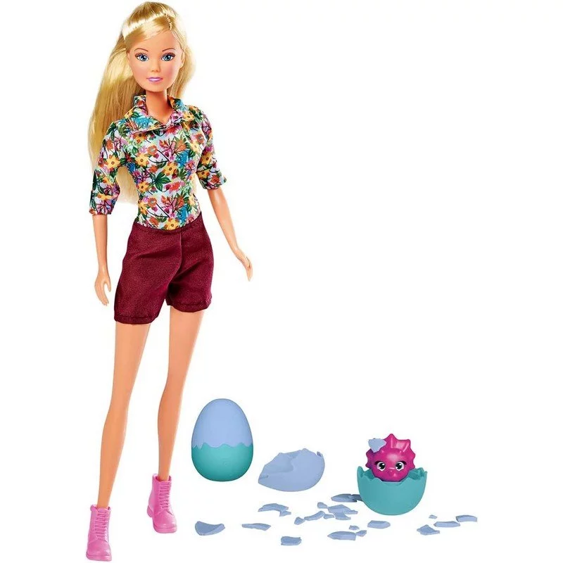 Join Steffi on an exciting dinosaur expedition with the Dino Surprise set! Steffi is dressed in adventure-ready shorts and a colorful shirt as she explores the prehistoric world. During her expedition, she discovers two large dinosaur eggs that children can “crack” open by hand to reveal adorable bab