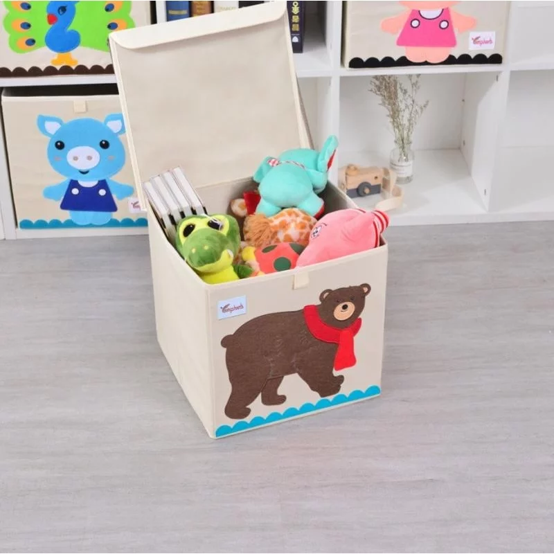 This cute animal toy chest is the perfect organizational tool for any room. With sides reinforced by cardboard, our toy chest attracts attention even when empty and the lid keeps all toys out of sight. This toy chest adds a pop of fun to every room and makes organizing toys or nursery items fun and