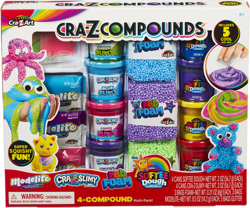 Get ready for super squishy fun with this amazing Cra Z Compounds kit. This 4-compound pack includes multiple unique compounds. Full of texture, colour & amazing compounds, it offers the ultimate sensory experience. Mix and blend the different compounds - squish, sculpt and stretch! Includes 5 super cool add ins - blend glitter into the compounds for a sparkly finish! Squeeze, mix & shape to create anything you can imagine. Set includes 4 cans of Softee Dough, 4 cans of Cra Z Slimy, 3 bags of Fab Foam, 3 bags of Modelite and 5 bags of glitter MODELITE – is the Super soft, air hardening modelling material a lightweight compound that doesn't crumble or flake and if put back into the airtight bag it can be used again and again. It can be painted with all types paint including watercolours, poster paints and acrylics. CRA Z SLIMY - This super soft, perfect consistency Slime can be stretched and moulded without tearing. Use your imagination and customize by adding the awesome glitter add ins for sparkly slime! Enough Slime for hours of endless fun! FAB FOAM - a squishy, mouldable compound with its own uniquely awesome beadlike texture! Mould it, squeeze it, stretch it. It’s
