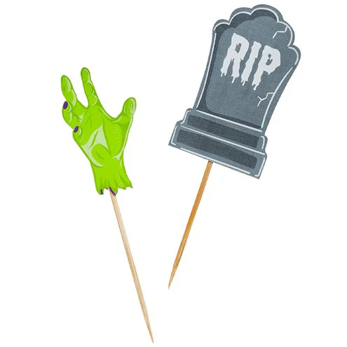 Pack contains 6 x zombie & 6 x gravestone food picks Each measure approx 15cm including pick Printed paper cake picks