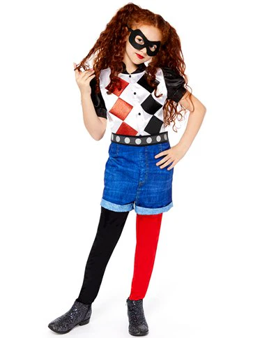 This officially licensed Harley Quinn costume is ideal for younger fans of this iconic Gotham villain. It's a comfy, easy to wear outfit that's suitable for all ages. Size: Age: 8-10 years Height: 51-55" (128-140cm)Chest: 26-28" (65-71cm)Waist: 23-25" (58-62cm) Material 100% Polyester Fastening Top has Velcro fastening Includes Shirt, Shorts with attached black & red leggings, detachable belt & eye mask