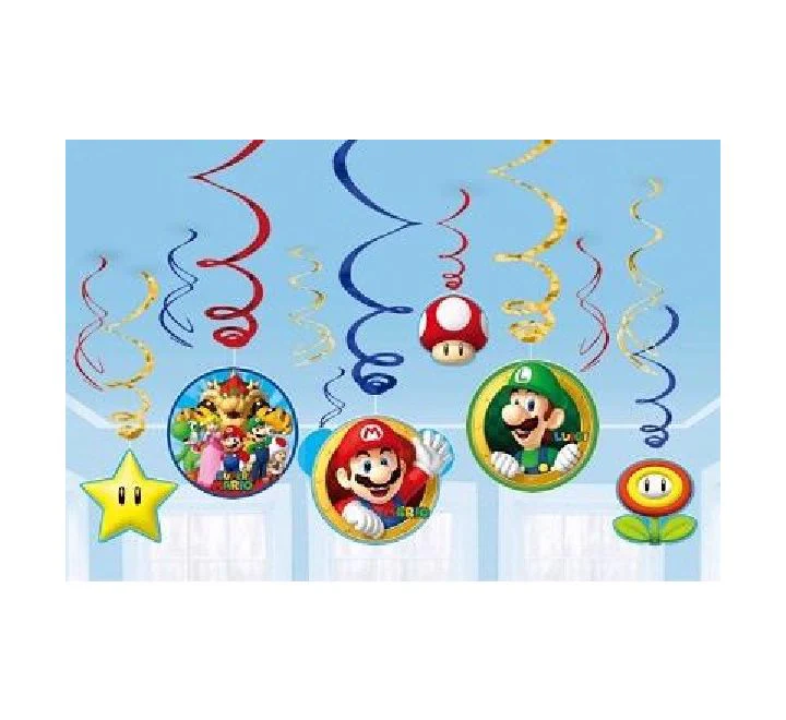 SUPER MARIO SWIRL DECORATIONS VALUE PACK OF 12 PIECES QUANTITY: 6 FOIL SWIRLS AND 6 SWIRL DECORATIONS APPROX PRODUCT SIZE: 3 FOIL SWIRL DECORATIONS CUTOUTS 17. 7CM AND 3 FOIL SWIRL DECORATIONS 12. 7CM