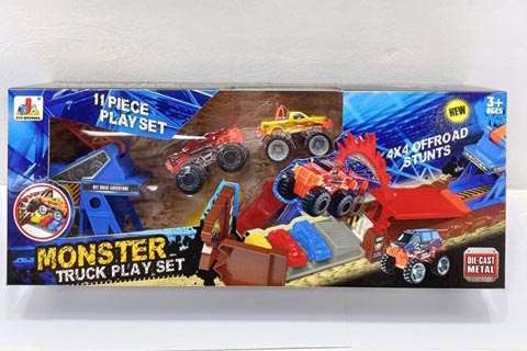 MONSTER TRUCK PLAY SET, 11 PIECES, DIE CAST METAL, 4X4 OFF ROAD STUNTS