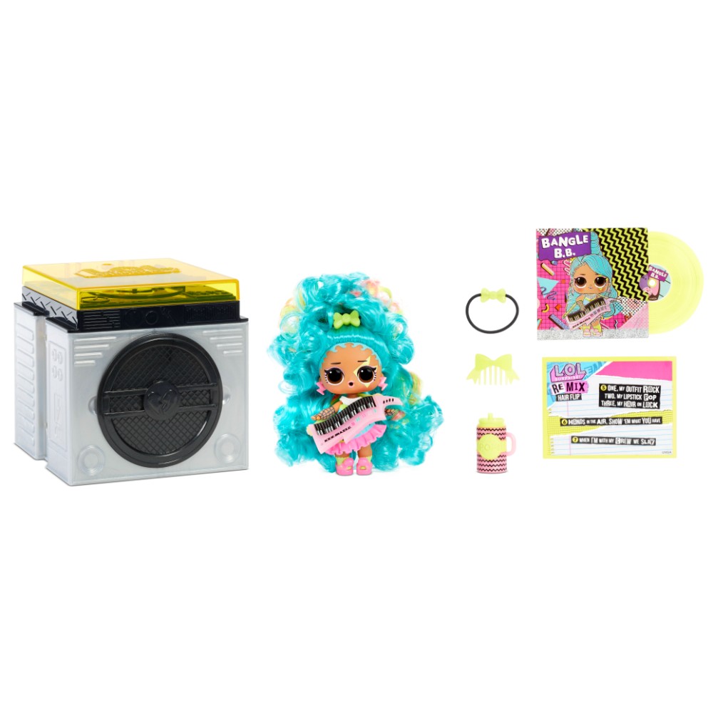 Product Name: L. O. L. Surprise Remix Hairflip Tots Overview: Unleash the excitement of music and surprises with the L. O. L. Surprise Remix Hairflip Tots! This collection brings together the fun of unboxing with the thrill of music, offering a unique play experience for fans of all ages. Description: The L. O. L. Surprise Remix Hairflip Tots features an array of surprises and interactive elements: 15 Surprises to Unbox: Each doll comes packed with 15 surprises, including a special Hair Flip surprise that reveals a new hair color or texture. Hair Flip Surprise: Unbox the doll’s hair from its fierce style to unveil a fun surprise! Will you discover a vibrant new color or a different texture? New Music Genre Characters: Meet all-new characters, each inspired by popular music genres such as Pop, R&B, Hip Hop, Country, and Rock. Each doll is equipped with music-themed accessories and styles. Unbox Our Song: The packaging plays music! Unbox the collectible mini record to hear a part of a surprise song directly from the record player packaging. Collect multiple records to complete the song. Build a Boombox: Combine your packaging from one L. O. L. Surprise Remix Pets package and two Hair Flip Tots packages to create a fun boombox for your dolls to enjoy. Complete the Lyrics: Each package includes a lyrics sticker that matches a number on the lyric sheet. Collect all lyric sheets from the Remix line to reveal the complete song, or mix and match to create your own unique remix. Color Change Surprise: Give your doll a fun bath to reveal a color change surprise! Just be careful not to get their hair wet! Specifications: Includes: 15 surprises including a Song Lyrics Sticker, Record Sleeve, Record, Record Player Package, music accessories, hair clips, a bottle, outfit, shoes, comb, Hair Flip Surprise, and L. O. L. Surprise Remix Hair Flip Tots doll. Collectible: Collect all 12 L. O. L. Surprise Remix Hair Flip Tots for the ultimate music-themed experience! Note: Item selection is random and comes in blind packaging; specific items cannot be requested, and duplicates may occur. Get ready to rock and roll with the L. O. L. Surprise Remix Hairflip Tots—where every unboxing is a musical surprise!