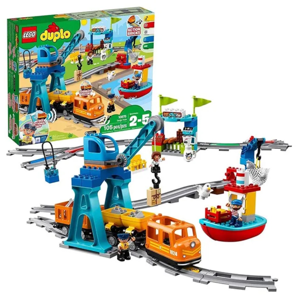 LEGO DUPLO Cargo Train (10875) Product Overview: The LEGO DUPLO Cargo Train set is a dynamic and educational toy designed to engage toddlers in imaginative play while laying the groundwork for STEM learning. Perfect for children aged 2 to 5 years, this electric train set encourages creativity and development through interactive features and easy-to-build components. Features: Comprehensive Set: Includes 105 pieces featuring 2 cargo wagons, a harbor, a boat, a café, 2 cranes, action bricks, and 24 track pieces. This versatile set offers a complete play experience with various elements to build and explore. Interactive Train: The battery-operated train features lights, sounds, and movement, adding a realistic touch to playtime. Activate the train’s functions using the included remote-control app for enhanced engagement. Figures Included: Comes with 3 LEGO DUPLO figures: a cargo train driver, a captain, and a shop owner, along with a bird figure to inspire creative scenarios and storytelling. Educational Benefits: Encourages language development, fine motor skills, and cognitive abilities through interactive play. The set’s design promotes problem-solving and imaginative thinking. Dimensions: Cargo Train Toy: Measures over 3 inches (10 cm) high, 18 inches (47 cm) long, and 3 inches (8 cm) wide. Large Crane: Measures over 13 inches (35 cm) high, 6 inches (16 cm) wide, and 6 inches (16 cm) deep.