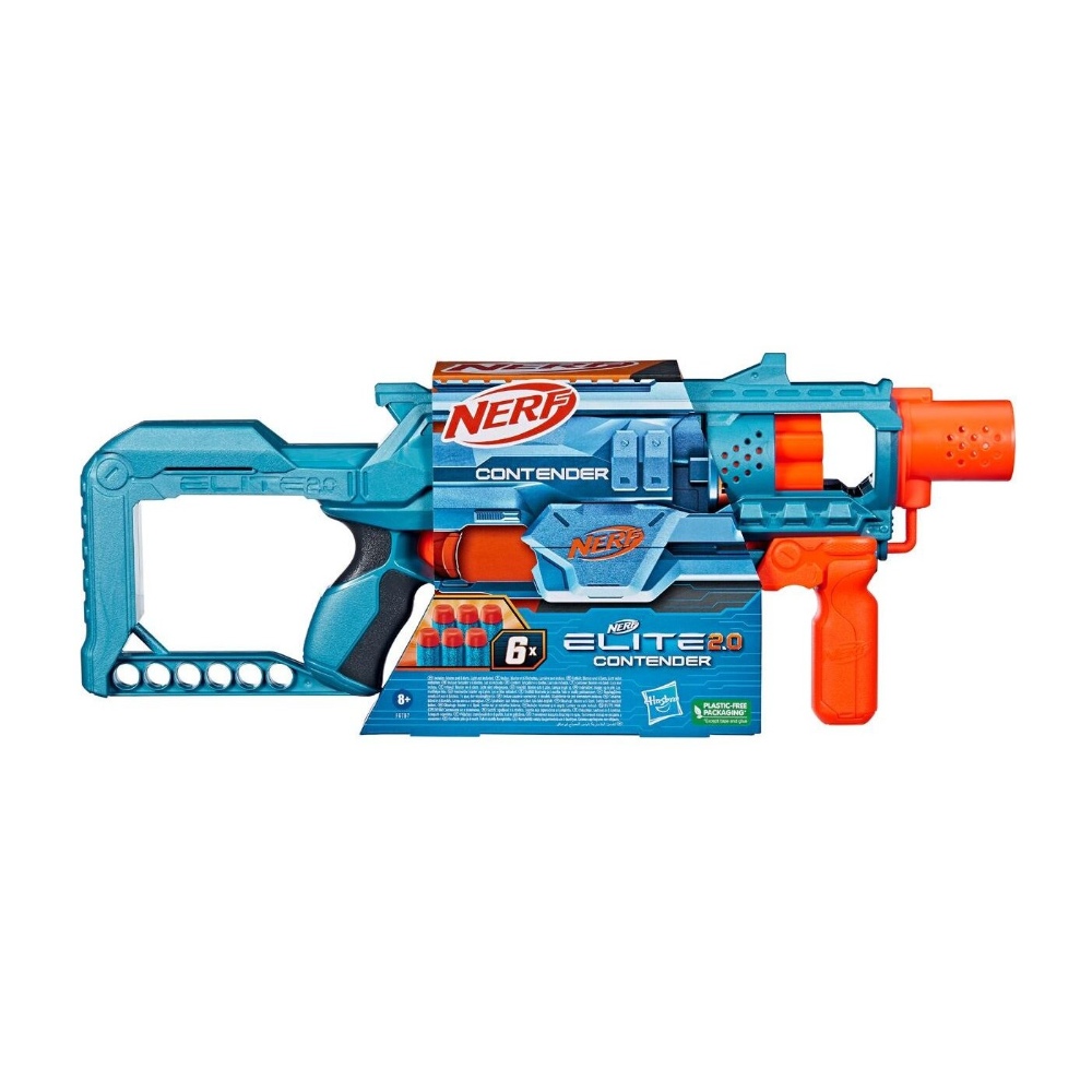 Nerf Elite 2. 0 Contender Blaster Product Overview: The Nerf Elite 2. 0 Contender Blaster from Hasbro is an ideal choice for Nerf enthusiasts seeking a reliable and exciting blaster. Designed for action-packed gameplay, this blaster combines performance and style, making it a standout addition to any Nerf collection. Features: High-Performance Blasting: Clip-Fed Design: The Contender blaster features a clip-fed mechanism that allows for quick reloading and continuous play. It’s designed to deliver powerful and consistent dart firing. Compact and Lightweight: Easy Handling: Its compact size and lightweight build make it easy to handle and maneuver during intense Nerf battles. Perfect for both indoor and outdoor play. Customization Options: Interchangeable Parts: The blaster is part of the Nerf Elite 2. 0 series, which means it offers customization options with other Elite 2. 0 accessories and components, allowing you to personalize your blaster for various play styles. Safety Information: Ages: Suitable for children aged 8 and up. Eye Safety: To avoid eye injuries, do not aim at eyes or face. Use of eyewear is recommended for players and those within range. Only use official Nerf darts to ensure safety standards are met. Choking Hazard: Contains small parts. Not for children under 3 years. Contents: 1 Nerf Elite 2. 0 Contender Blaster 1 Clip (Capacity varies) Darts (Number included varies by set) Instructions Summary: The Nerf Elite 2. 0 Contender Blaster is designed for fans who want a high-performance, customizable blaster that delivers reliable action and exciting gameplay. Its compact design and easy handling make it suitable for a range of Nerf battles, whether at home or outdoors. Ideal for kids aged 8 and up, it’s a great addition to any Nerf enthusiast’s collection.