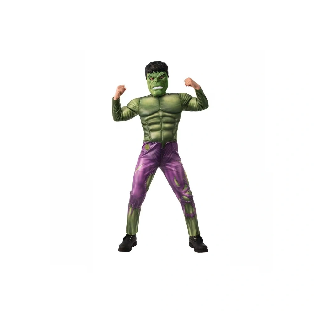 The Rubie’s 300991-S Avengers Deluxe Hulk small costume is a full-body jumpsuit with a muscular padded chest and arms, designed to transform a child into the iconic green Avenger. It includes a separate character mask.