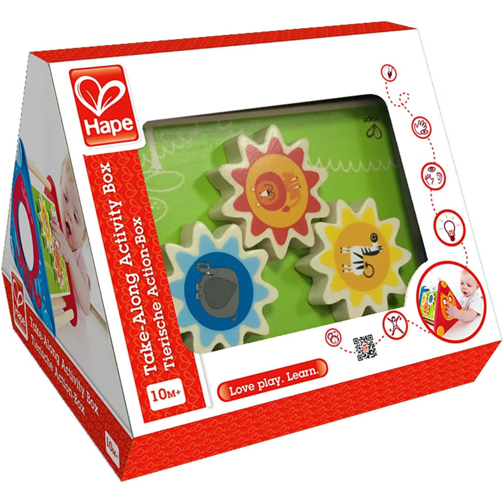 Hape Take-Along Activity Box (Model E0434) Overview: The Hape Take-Along Activity Box is a versatile wooden toy designed to engage infants aged 10 months and above. This compact, five-sided activity center offers a variety of interactive elements, including moving gears, balls, blocks, and a maze, all encased in a sturdy wooden frame. Its lightweight design and convenient handles make it ideal for travel, allowing babies to enjoy stimulating play wherever they go. Key Features: Age Range: Suitable for children aged 10 months and up Dimensions: Approximately 24. 6 cm (L) x 21. 1 cm (W) x 23. 4 cm (H) Materials: Crafted from durable wood with non-toxic, water-based paints Design: Features a friendly owl motif with winking eyes and vibrant colors Interactive Elements: Includes moving gears, balls, blocks, and a maze to stimulate fine motor skills and problem-solving abilities Developmental Benefits: Encourages emotional development, fine motor skills, and problem-solving Safety Information: This toy meets European and American safety standards EN 71 and ASTM F963 Adult supervision is recommended during play Regularly check for any loose parts or damage Clean with a damp cloth; do not immerse in water