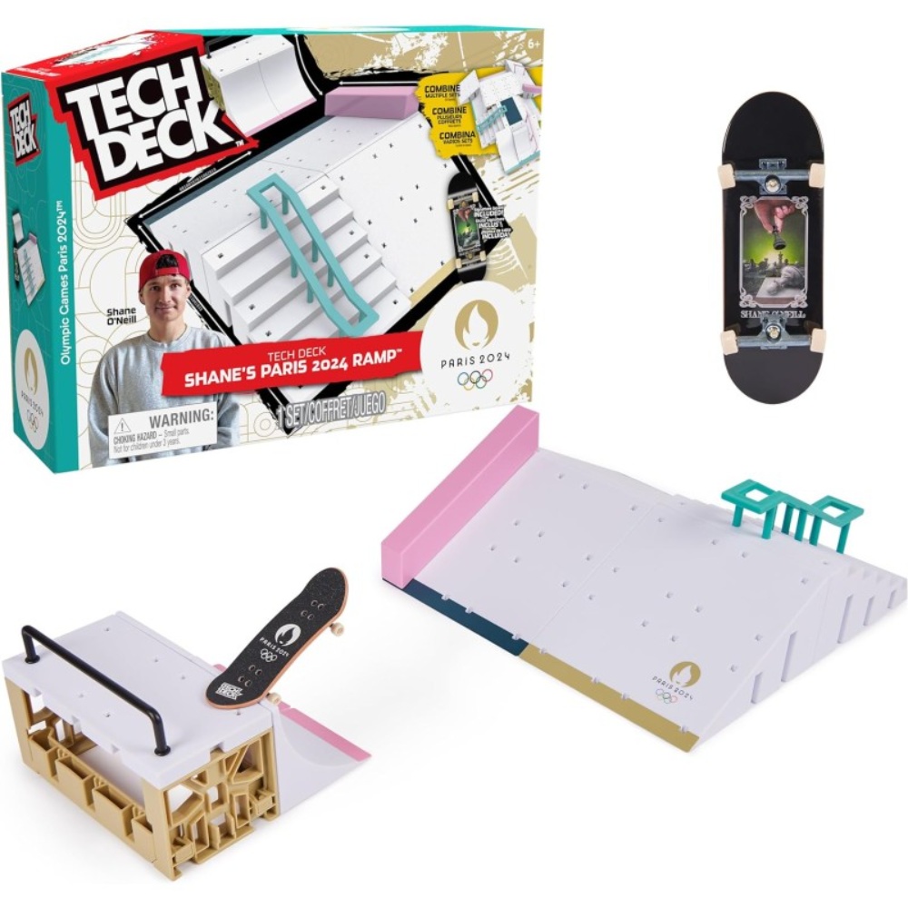 Product Name: Tech Deck Shane’s Olympic Ramp Overview: Create your own Olympic skatepark with Shane’s Olympic Games Paris 2024 Ramp playset! This exciting mini fingerboard skatepark features various obstacles to enhance your trick skills while having fun. Perfect for aspiring skaters and collectors alike! Description: The Tech Deck Shane’s Olympic Ramp brings the thrill of the skatepark into your home. With multiple obstacles, including rails and ramps, this set allows you to customize your skatepark setup and practice a variety of tricks. Featuring the Shane O’Neill pro fingerboard, you can grind the rail, slide the Hubba ledge, and aim for Olympic-level stunts. Specifications: Ages: Recommended for ages 6 and up Contents: 1 Tech Deck Fingerboard 7 Ramp Pieces 1 Square Rail 1 Round Rail 2 Scaffoldings 2 Scaffold Beams 8 Rubber Feet 5 Large X-Connectors 12 Small X-Connectors X-Connect Feature: Compatible with other X-Connect playsets for endless skatepark configurations Additional Information: Customizable Design: Create your own unique skatepark layout and enhance your fingerboarding experience. Skill Development: Perfect for developing fine motor skills, balance, and coordination through play. Collectible Fun: Ideal for boys and girls who love collecting mini skateboards and figures. Gift Idea: A fantastic gift option for birthdays or holidays for young skaters and collectors. Officially Licensed Product: Embrace the spirit of the Olympic Games with this officially licensed skatepark accessory.