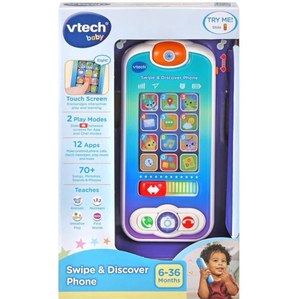 The VTech Baby Swipe & Discover Phone introduces babies to early learning through interactive pretend play. With swipe motion, light-up buttons, and cheerful sounds, it supports sensory development and fine motor skills. A safe and engaging toy trusted by families and gift buyers across the GCC.